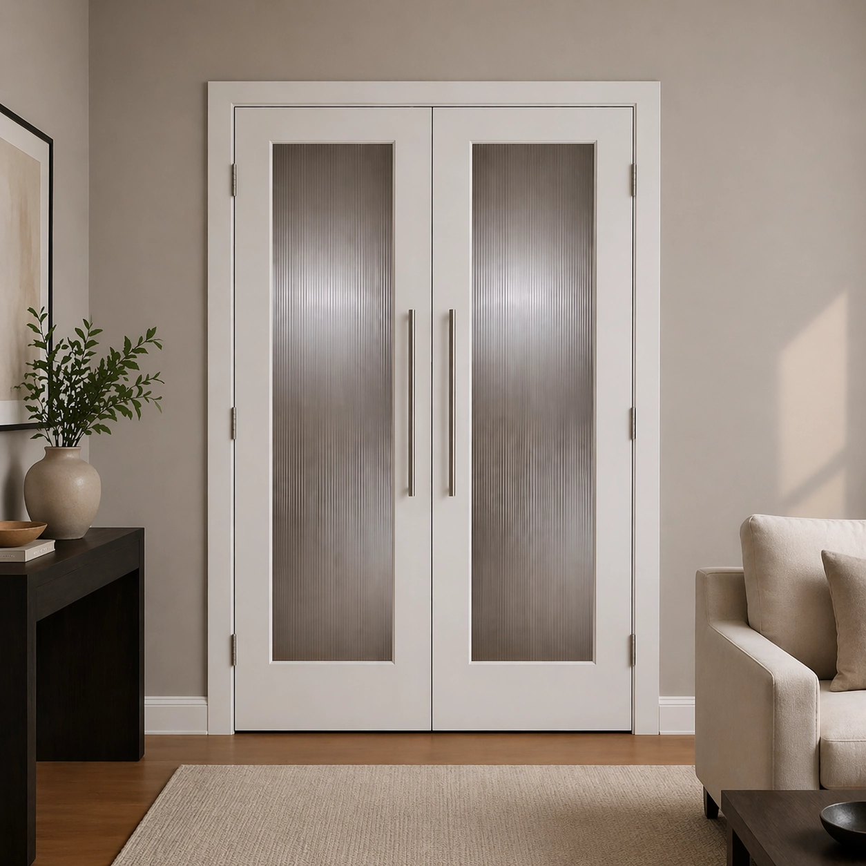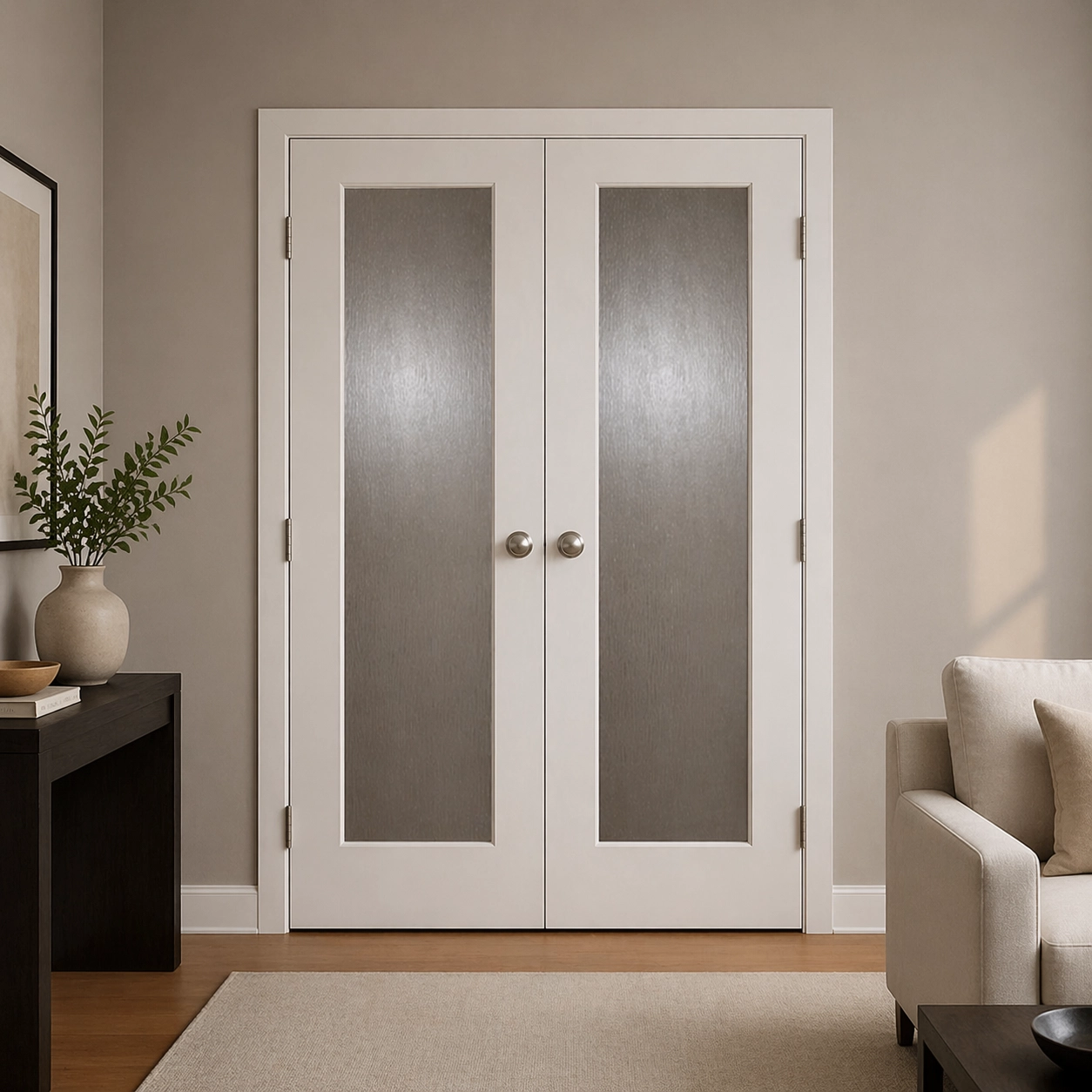 Ideal for wider openings, the double door configuration offers both openness and privacy, making it a great choice for bedrooms, dining areas, pantries, or other interior spaces. The raindrop textured glass provides excellent privacy while maintaining a bright and inviting atmosphere. Its elegant design pairs seamlessly with compatible doorlites, helping you achieve a cohesive and modern interior aesthetic.